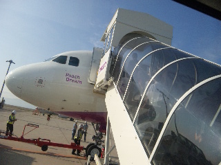 バスに乗って 飛行機のタラップまで、
