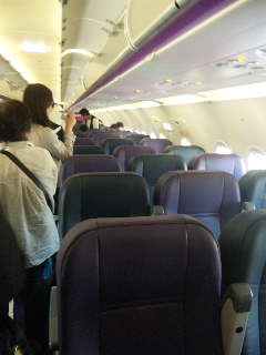 白と紫の 機内に
