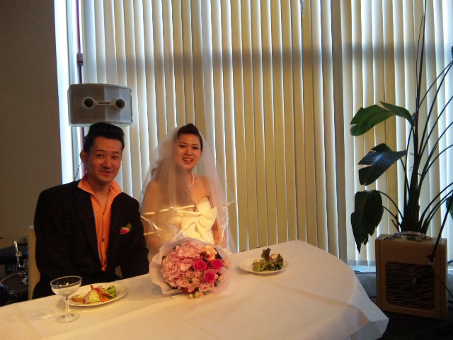 窓の向こうに かわいいウェディングドレスの